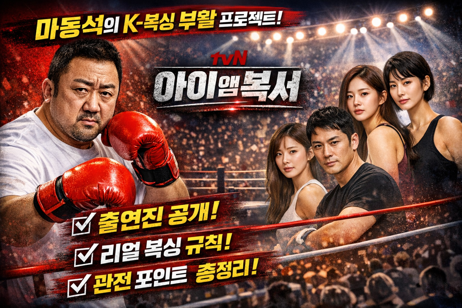 영화 '범죄도시'에서 멋진 복싱 실력을 보여준 마동석이 직접 기획하고 출연한다는 소식만으로도 제작 단계부터 엄청난 화제를 모았던 아이 엠 복서. 뚜껑을 열어보니 단순한 연예인 운동 예능이 아닌 진짜 복싱의 매운맛을 보여주고 있는 이 프로그램의 모든 것을 정리해보겠습니다.