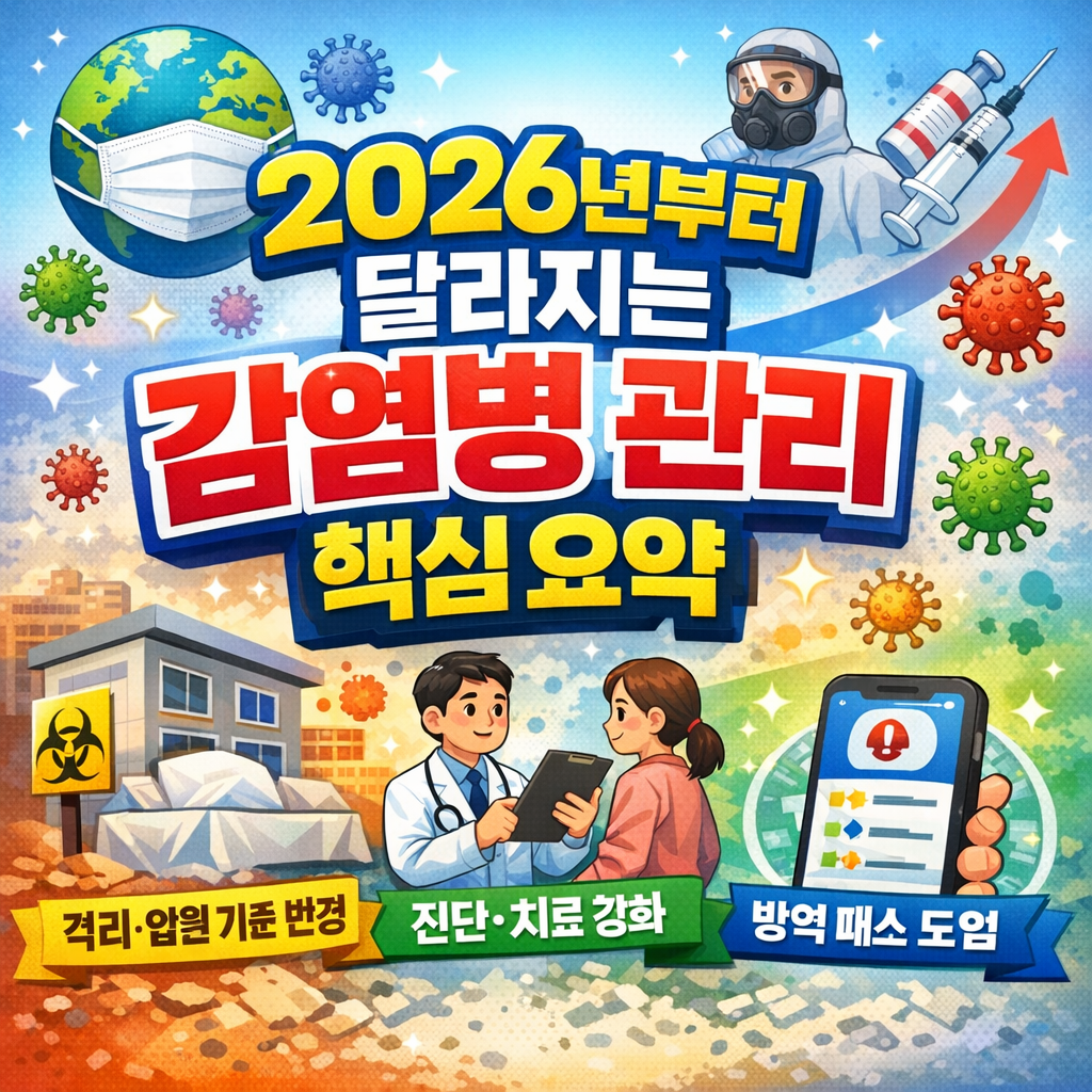 2026년은 감염병 관리의 패러다임이 '통제'에서 '데이터와 자율'로 넘어가는 해입니다. 특히 아이를 키우는 가정에서는 6가 백신 도입 소식을, 일반 시민분들은 완화된 격리 규정과 스마트 방역 시스템에 주목해 보시면 좋을 것 같습니다!